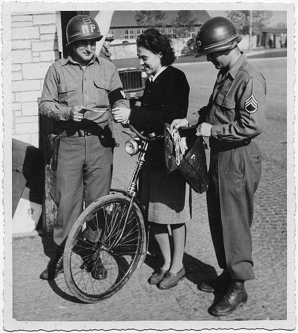 Unter dieser Betitelung veröffentlichte die Schwäbische Landeszeitung am 6. November 1945 das Foto einer Torkontrolle durch US-Soldaten. Es ist eines der wenigen offiziellen Fotodokumente über die Besatzungsarmee unmittelbar nach Kriegsende. Die Aufnahme entstand am Nordtor der ehemaligen Luftgau-Nachrichtenkaserne, bevor der Grasiger Weg an dieser Stelle zum „Pfersee Gate“ umgestaltet wurde.