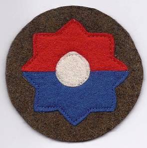 Links: Von Mai 1945 bis Februar 1946 belegten Teile der 71st Infantry Division "Red Circle" die Augsburger Kasernen. Danach wurde sie von der 9th Infantry Division (rechts) abgelöst. Beide Divisionen gehörten noch zu den Besatzungsdivisionen des Zweiten Weltkrieges. Das Symbol der 9th Infantry Division beruht auf einem Octofoil.