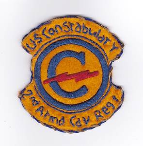 Links: Zur Aufrechterhaltung der öffentlichen Ordnung und der Besatzungsmacht befanden sich von Mai 1946 bis Ende 1948 die Constabulary-Truppen in Augsburg. Rechts: Die Verstärkung dieser polizeiähnlichen Militäreinheit mit z.T. schweren Kampfpanzern führte danach zur Umbildung in das Constabulary 2nd Armored Cavalry Regiment. Ab Herbst 1951 wurden die Constabler an die innerdeutsche Zonengrenze verlegt, um dort die Grenzsicherung Westdeutschlands zu gewährleisten (handgesticktes Abzeichen).