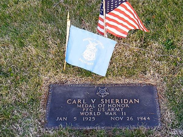 Diensteintritt in: Baltimore, Maryland. Geboren: Baltimore, MD. G.O. Nr.: 43, 30. Mai 1944. Belobigung: Die K Kompanie, die am 26. November 1944 dem 2. Bataillon der 47. Infantrie für den Angriff auf Burg Frenzenberg in der Nähe von Weisweiler zugeteilt worden war, hatte nach einem Vorstoß von 1.000 Yards (= 914 m) unter vernichtendem Sperrfeuer feindlicher Artillerie und Mörser zwei Gebäude im Burghof eingenommen, wonach ihr jedoch nur eine Ist-Kampfstärke von 35 Mann verblieb. Während des Vorstoßes hatte der Obergefreite Sheridan, der als Panzerfaustschütze fungierte, die Einstellung des feindlichen Feuers ertrotzt und sich die zusätzlichen Hohlladungsgeschosse*) besorgt, die sein verwundeter Munitionsträger transportiert hatte. Als er sich seiner Kompanie in den eroberten Gebäuden anschloss, fand er sie in wütendem Kampf mit etwa 70 feindlichen Fallschirmjägern, die das Torhaus der Burg besetzt hielten. Dies war ein massiv gebautes Gebäude aus Stein, das von einem tiefen, 20 Fuß (= 6,1 m) breiten Graben umgeben war. Der einzige Zugang zu dieser verbissen verteidigten Stellung war über den Hof und eine Zugbrücke, die zu einer verbarrikadierten Eichentür führte. Als dem Obergefreiten Sheridan klar wurde, dass die einzig verfügbare Waffe, die stark genug war, die dicken Eichenbohlen zu durchdringen, seine Panzerfaust war, gab er unter völliger Missachtung seiner eigenen Sicherheit den Schutz der Gebäude auf und überquerte, dem schweren und intensiven Feuer von Handfeuerwaffen und Granaten die Stirn bietend, den Hof zum Zugang der Zugbrücke, wo er direkt auf die Tür feuern konnte. Obwohl er durch das Fehlen eines Helfers behindert und ein konstantes Ziel für das feindliche Feuer war, das um ihn herum einschlug, setzte er seine schwierig zu handhabende Waffe so geschickt und effektiv ein, dass es ihm gelang, zwei gut gezielte Geschosse im Bauwerk zu platzieren. Als er bemerkte, dass die Tür nur beschädigt war, und ihm klar wurde, dass für einen erfolgreichen Angriff eine Öffnung geschaffen werden musste, lud er sein letztes Geschoss, zielte sorgfältig und sprengte ein Loch in die schweren Planken. Während er sich zu seiner Kompanie umdrehte, schrie er: „Kommt mit, jetzt machen wir sie fertig!“ Mit seiner 45er Pistole feuernd stürmte er in die klaffende Öffnung und wurde von dem vernichtenden Feuer, das ihm entgegenschlug, getötet. Der entscheidende Angriff auf die Burg Frenzenberg wurde durch die Bresche vorgetragen, die zu schlagen der Obergefreite Sheridan sein Leben gegeben hatte.