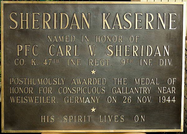 Citation: Attached to the 2d Battalion of the 47th Infantry on 26. November 1944, for the attack on Frenzenberg Castle, in the vicinity of Weisweiler, Germany, Company K, after an advance of 1,000 yards through a shattering barrage of enemy artillery and mortar fire, had captured 2 buildings in the courtyard of the castle but was left with an effective fighting strength of only 35 men. During the advance, Pfc. Sheridan, acting as a bazooka gunner, had braved the enemy fire to stop and procure the additional rockets carried by his ammunition bearer who was wounded. Upon rejoining his company in the captured buildings, he found it in a furious fight with approximately 70 enemy paratroopers occupying the castle gate house. This was a solidly built stone structure surrounded by a deep water-filled moat 20 feet wide. The only approach to the heavily defended position was across the courtyard and over a drawbridge leading to a barricaded oaken door. Pfc. Sheridan, realizing that his bazooka was the only available weapon with sufficient power to penetrate the heavy oak planking, with complete disregard for his own safety left the protection of the buildings and in the face of heavy and intense small-arms and grenade fire, crossed the courtyard to the drawbridge entrance where he could bring direct fire to bear against the door. Altbough handicapped by the lack of an assistant, and a constant target for the enemy fire that burst around him, he skillfully and effectively handled his awkward weapon to place two well-aimed rockets into the structure. Observing that the door was only weakened, and realizing that a gap must be made for a successful assault, he loaded his last rocket, took careful aim, and blasted a hole through the heavy planks. Turning to his company he shouted, "Come on, let's get them!" With his .45 pistol blazing, he charged into the gaping entrance and was killed by the withering fire that met him. The final assault on Frenzenberg Castle was made through the gap which Pfc. Sheridan gave his life to create.