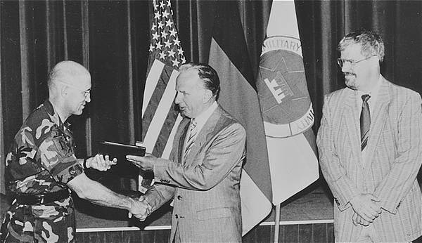 BG Creighton W. Abrams Jr. (left) and Patrick B. Bennett, Deputy DEH (right), give a retiring local national employee of many year´s standing an official farewell. 1991.