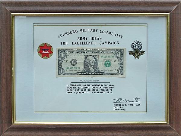 A symbolic dollar award for participating in an idea contest.