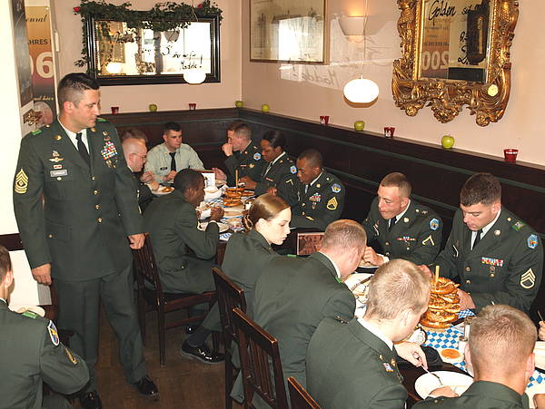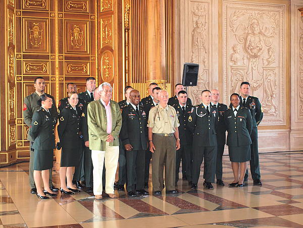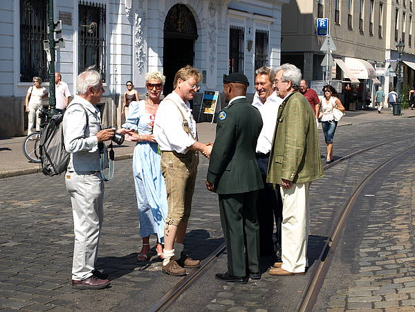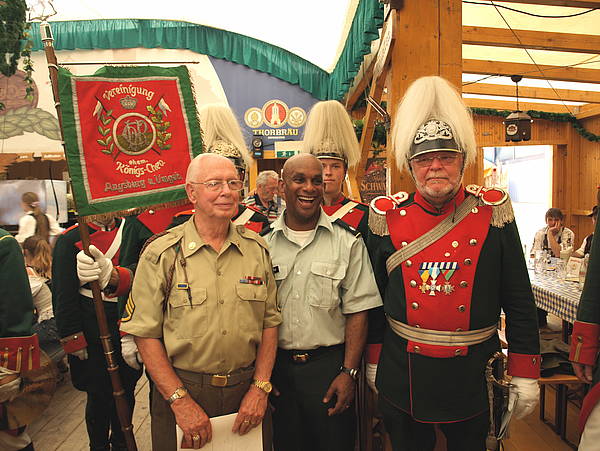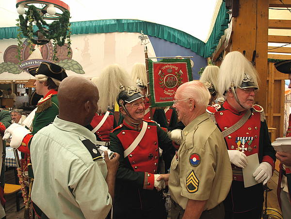 Die städtische Betreuung übernahm wiederum Altbürgermeister Theo Gandenheimer. Mitbesucher war auch der 80-jährige US-Veteran Clifford Briggs, der bereits 1946 in Augsburg stationiert war und in einem der Plärrerfestzelte vom Augsburger „Chevau-léger“ Verein und dem traditionellen „Spielmannszug Augsburg“ mit Musik geehrt wurde. Neben der Besichtigung des Goldenen Saals stand auch ein bayerisches Weißwurstessen in einem Lokal am Königsplatz an, bevor sich die Abordnung zum Umzug aufstellte. Dort wurden die Gäste von Oberbürgermeister Dr. Paul Wengert mit Gattin begrüßt.