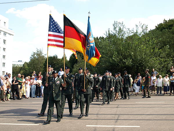 Bevölkerung die Erinnerung an die lange Truppenpräsenz der US-Army in der Fuggerstadt aufrecht erhalten werden. Diesmal konnte eine Fahnenabordnung mit 20 Soldaten und Soldatinnen der 66th Military Intelligence Group aus Darmstadt, geführt von LTC Ivory Freeman, gewonnen werden, die amerikanische, die deutsche und ihre eigene Truppenflagge mitzuführen. Die MI war die letzte in Augsburg dienende Einheit.