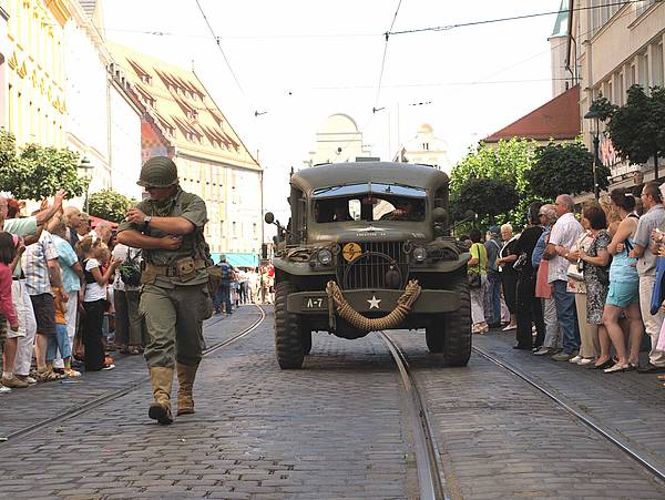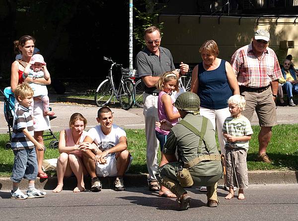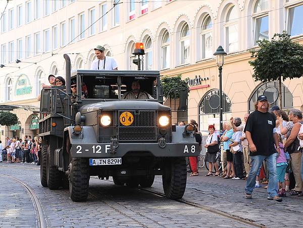 Die 20 Soldatinnen und Soldaten beteiligten sich unter der Leitung von Lieutnant Colonel Ivory Freeman an einer "Color Guard", eine der höchsten Ehrerbietungen gegenüber einem Gastland. Nach der Stadtführung und einer bayerischen Leberkäsbrotzeit marschierte die Fahnenabordnung zusammen mit historischen Fahrzeug- und Uniformdarbietungen durch die Innenstadt zum Plärrergelände. Beeindruckend dargestellt haben dabei die "Reenactors" das Kriegsende mit dem Verteilen von Kaugummis an Kinder am Straßenrand.