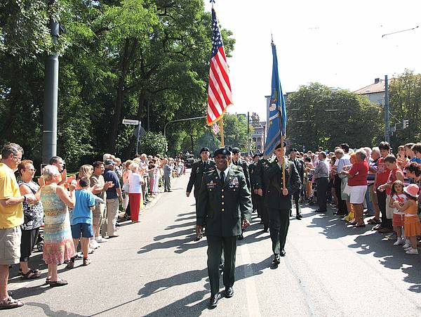 Invited by the City of Augsburg as well as the Amerika in Augsburg Society, once again, the last U.S. Army unit to serve in Augsburg, came to join the big Plärrer Fair Parade in the Fugger City. Special inducement for the invitation of the 66th Military Intelligence Battalion from Darmstadt was the 10th anniversary of Augsburg base closure. This year again, City and Society wanted to demonstrate their bond with the U.S. Forces and their families. Twenty soldiers - male and female - led by LTC Ivory Freeman took part in a Color Guard, one of the highest honors to a host nation.
