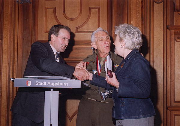 It was a great honor for the society Amerika in Augsburg e.V., to show the nine aged veterans of the “last as well as the first hour” a welcome gesture of understanding between the nations. Among the former soldiers, several even wearing their original uniforms, was “Mickey” Mason Hardin Dorssey, who served as 71st Infantry Division’s supply manager in Flak Kaserne and who was a very good friend of a family in Waldberg near Augsburg.