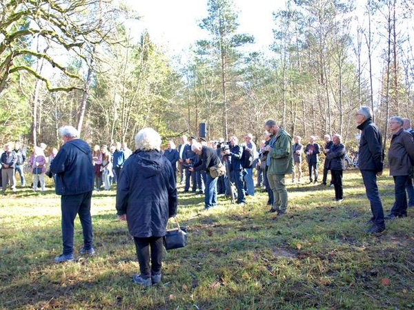 Die weitere Entwicklung führte zu einer Gedenkstätte vor dem großen Kugelfang am „Eulen Geräumt“. Diese wurde am 25.10.2022 von der Stadtdirektorin Dr. Melanie Haisch und Jutta Goßner, Vorsitzende des Kulturkreises Haunstetten, vor ca. 40 Gästen feierlich eingeweiht. Beeindruckende Ansprachen führten auch Dr. Markus Perpeet vom Bundesforstbetrieb Hohenfels und Dr. Herbert Veh, Landesgerichtspräsident a.D. durch. Gesegnet wurde der Gedenkort von zwei Geistlichen der Haunstetter Christuskirche.
