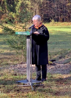 Jutta Goßner vom Kulturkreis Haunstetten schilderte die Bemühungen ihres Vereins zur Aufklärung der Todessschicksale und deren Gedenkens. Links die Vorderseite der Informationsstele.