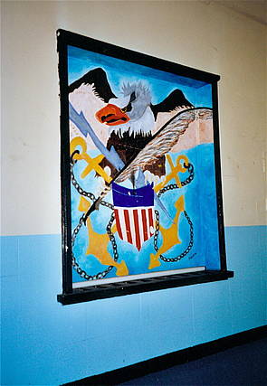 The following examples prove a remarkable creativity, which disappeared into oblivion when the kasernes were demolished. Amerika in Augsburg e.V. would like to recall these (unknown) soldier-artists to the public mind. Most impressive were two works of art in Sheridan Kaserne: An overdimensional Stars and Stripes billowing in the wind, found in the attic gym of Bldg 125 (former motor pool bldg) as well as a huge scene of a river crossing under fire in the main stairwell of Headquarters Bldg 101.