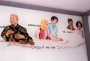 After the Augsburg base closure by the U.S., the inside of the buildings revealed an impressive variety of mural paintings by U.S. soldiers to the visitor. Predominant were the ensignia of the respective units, but there were also fanciful statements of duty and leisure as well as military slogans and other symbols.