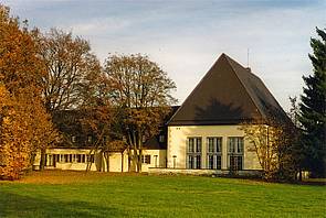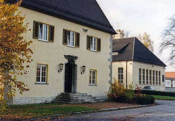 Prunkstück des Gebäudes ist der mit hohen Fensterfronten nach Westen ausgerichtete Festsaal, dessen kolossales Wandgemälde mit einer Schlachtenszene auf dem Lechfeld (a.d. 955) dem Raum eine geradezu martialische Dimension verleiht. Die Türen der gläsernen Fensterfront führen zu einer leicht erhöhten, vorgelagerten Großterrasse, die heute noch vom Baumbestand aus der Erbauungszeit beschattet und von der später entstandenen Winkelanordnung des Bauensembles schutzvoll eingerahmt wird. Die bauliche Integrität wird insbesondere durch die unterschiedlichen Walmdächer betont.