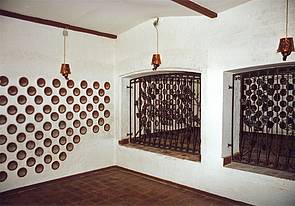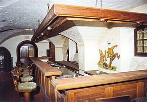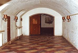 In Anspruch genommen wurden hierzu auch die im Keller gelegenen Trinkstuben mit Kachelöfen, Holzvertäfelungen, Glas- und Wandmalereien mit humorigen Trinksprüchen sowie die dort gelegenen Wein- und Vorratskeller samt einer trutzigen Trinkbar. Massiver Stein und üppige Eichenholztüren prägten sogar unter Tage die Philosophie der NS-Architektur und ihre vermeintliche Unvergänglichkeit. Die weiß gestrichenen Ziegel, die mit einer bogenförmigen Decke das Ambiente des Kellergewölbes eindrucksvoll zum Ausdruck bringen, wurden am Boden mit Steinplatten verschiedener Brauntöne markant in Kontrast gesetzt.