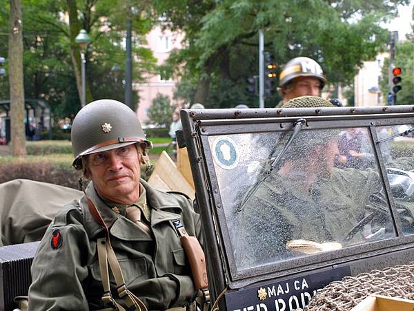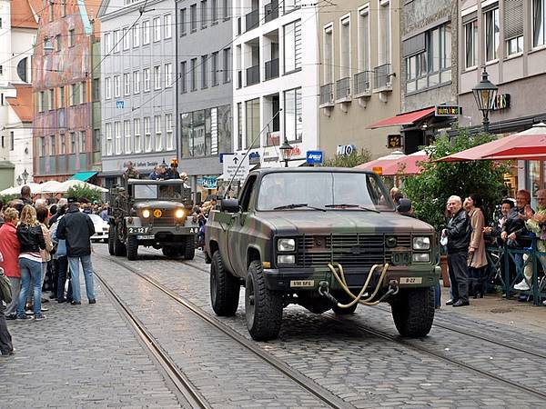 Der Umzug mußte also von den historischen "Reenactors" mit Originalfahrzeugen und -uniformen verschiedener Epochen (ab 1944) allein gestaltet werden. Mit der obligatorischen Verteilung von Kaugummi handelten sie sich viel Begeisterung bei den Augsburger Bürgern am Straßenrand ein.