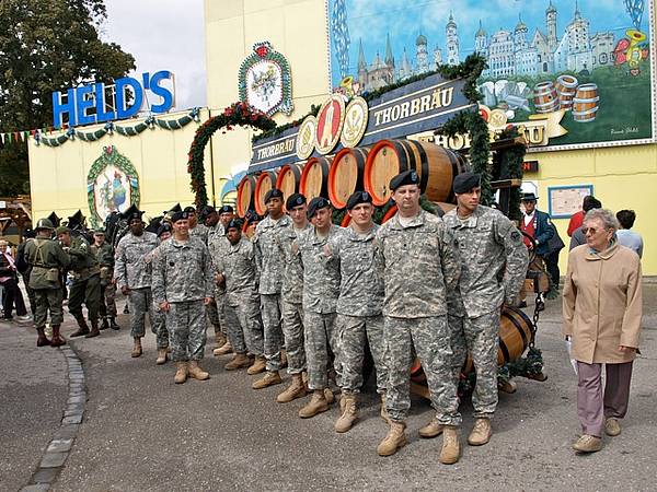 18 Soldatinnen und Soldaten der 66th Military Intelligence Brigade aus Wiesbaden gelang es jedoch leider nicht, rechtzeitig zum Umzug nach Augsburg zu kommen. Der starke Urlauberverkehr, Unfälle und Baustellen sorgten für Autobahnstaus, die zu einer erheblichen Verspätung der US-Abordnung führten. So konnten sie lediglich noch dem anschließenden Bierzelt- und Plärrertreiben beiwohnen, was sich zusammen mit den historischen Teilnehmern und anderen Zufallsgästen zu einer äußerst unterhaltsamen Zusammenkunft entwickelte.