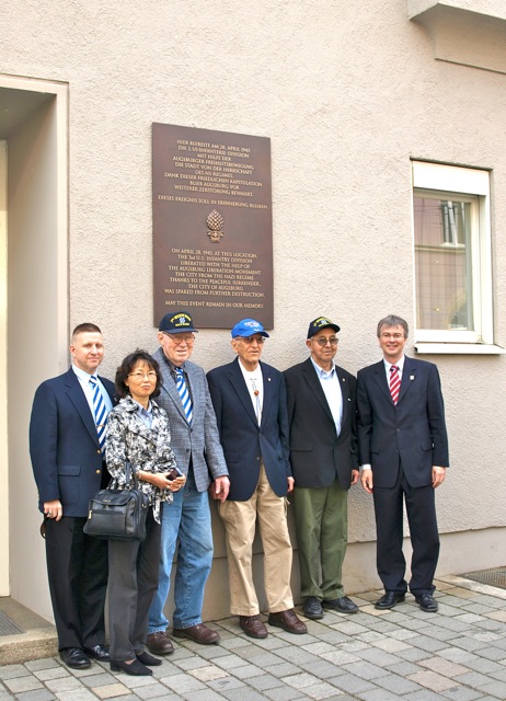 Erinnerungsfoto an der Gedenktafel zur Befreiung Augsburgs durch die 3rd Infantry Division am 28. April 1945.