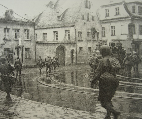 Einmarsch der US-Truppen in der Fuggerstraße bei heftigem Graupelschauer. Links das ehemalige Anna-Gymnasium.