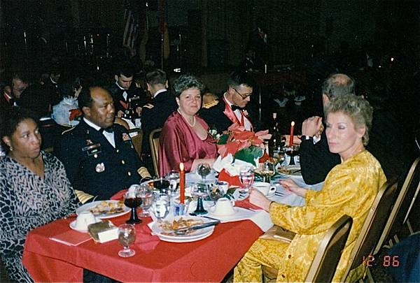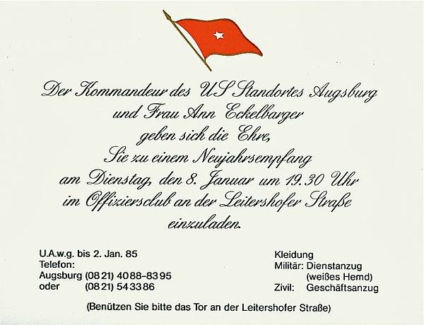 In den Jahrzehnten der amerikanischen Truppenpräsenz entwickelte sich inner- wie außerhalb der Kasernen ein gesellschaftliches Leben, das gleichwohl von militärischen wie persönlichen Akzenten gezeichnet war. Eine ganz besondere Rolle spielten dabei die elitär geprägten Veranstaltungen im Offizierskasino der Sheridan Kaserne. Dort wurde in stilvollem Ambiente zu offiziellen Empfängen bei Kommandoübergaben, Deaktivierung oder Reorganisation von Einheiten, Deutsch-Amerikanische Freundschaftswochen, Sommernachtsbällen, St. Barbara Dinner, Thanksgiving, Neujahrsempfängen u.a. eingeladen. Die meist gehefteten Einladungsbroschüren enthielten Schilderungen zum Ereignis, Beschreibungen des Veranstaltungsablaufs, Biographien betreffender Persönlichkeiten, Speisekarten und Hinweise zur gewünschten Kleiderordnung sowie Kostenbeiträge für den Verzehr. Neben der militärischen Garde wurden Personen des öffentlichen Lebens Augsburgs ebenso mit Einladungen bedacht wie Ehrenmitglieder bestimmter Einheiten und Repräsentanten Deutsch-Amerikanischer Clubs. Daneben entwickelten sich auch ganz private Verbindungen. Die nachfolgenden Bilder vermitteln einen Eindruck der militärisch-zivilen Gesellschaftskultur Augsburgs in den 80er Jahren.