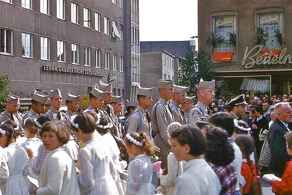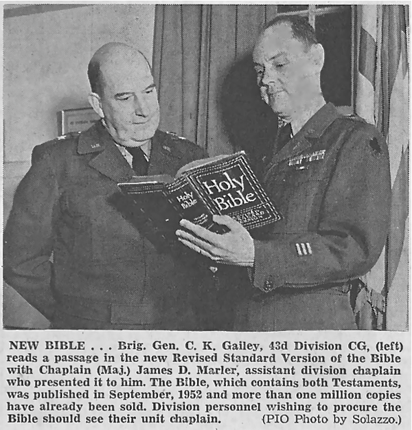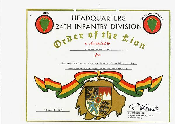 Auszeichnung des evangelischen Kirchenrates Erhard Ratz, der von 1963-1969 in der amerikanischen Garnison in Augsburg Gottesdienste abhielt. Ratz war zu dieser Zeit Pfarrer in der evangelischen Kirche St. Lukas, Firnhaberau. Er verstarb 2018. (Quelle und Dokument: Pfarrer Andreas G. Ratz, Sohn).