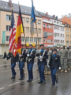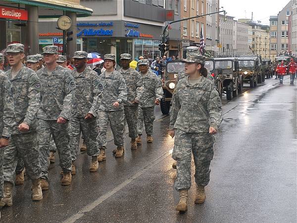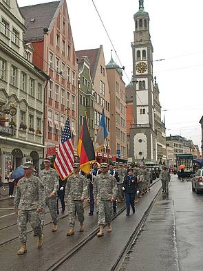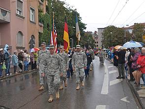 Auf Einladung des Oberbürgermeisters Dr. Kurt Gribl der Stadt Augsburg und des Vereins Amerika in Augsburg e.V. erhielten die GIs der zuletzt hier und in Gablingen stationierten Nachrichteneinheit erneut die Gelegenheit, im traditionellen Festumzug des Augsburger Herbstplärrers mitzuwirken. Zusammen mit privaten, historischen Armeefahrzeugen marschierten die mit Tarnanzug gekleideten Soldatinnen und Soldaten - bei leider regnerischem Wetter - die Wegstrecke von der St. Ulrich-Kirche zum Plärrergelände. Für viele Augsburger wurden beim lautstarken "cadence caller" Gesang wieder persönliche Erinnerungen an die Zeit der 53-jährigen US-Präsenz wach. Besonders erfreulich war auch die erstmalige Teilnahme einiger hier verbliebenen Veteranen der "American Legion Augsburg Post GR 13".