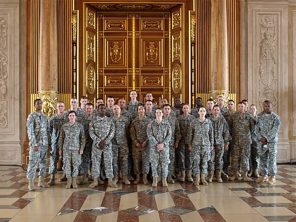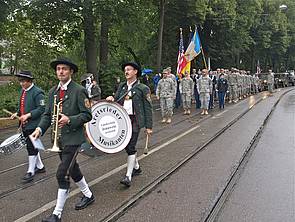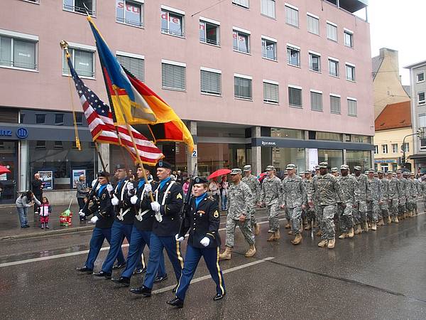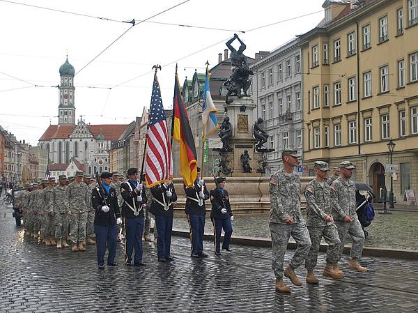 Nachdem Straßenbaustellen und Ferienverkehr die rechtzeitige Teilnahme der 66th Military Intelligence Brigade im Vorjahr vereitelten, revanchierten sich die US-Soldaten aus Wiesbaden heuer nicht nur mit einer pünktlichen, sondern auch mit einer äußerst mann- und frauenstarken Truppe: Brigadekommandeur Colonel Gregory Zellmer und Command Sergeant Major Marc A. Scott vom 24th Military Intelligence Battalion ließen es sich nicht nehmen, mit einer erstmals 55-köpfigen Abordnung incl. Color Guard Augsburg die Ehre zu erweisen.
