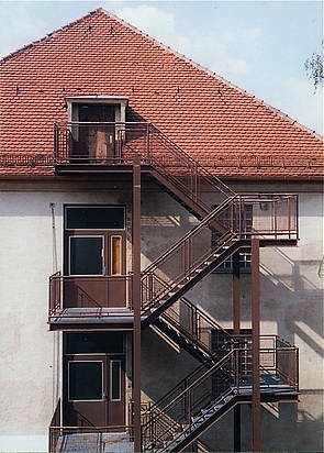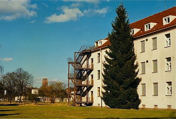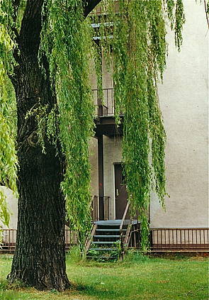 Rettung ins Grüne: Die von den Amerikanern angebrachten Feuerfluchttreppen führten bisweilen zu prachtvollen Trauerweiden, die zur früheren Wehrmachtszeit zwischen den Unterkunftsblöcken gepflanzt wurden.