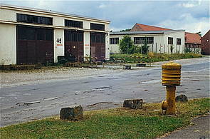 Links: Lager- und Werkstättenbereich des Bauhofs und Baumaschinenparks (Engineer Supply Point) außerhalb des Kasernengeländes zwischen Somme- und Reinöhlstraße. Dort befand sich in früheren Jahren auch das AYA Community Center. Rechts: Garagen an der Haupteinfahrt Sommestraße.