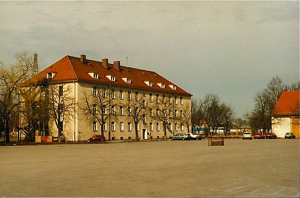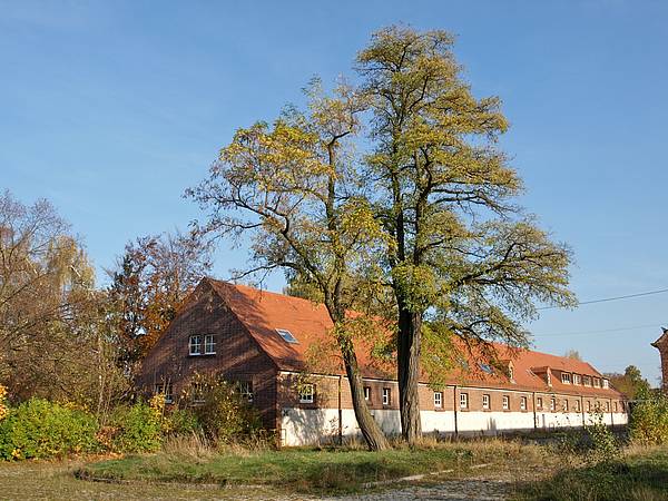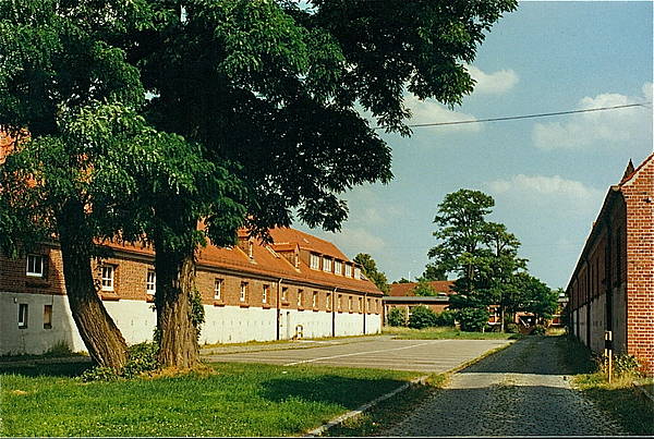 Alte Akazienbäume stehen im Kontrast mit dem Ziegelrot der Stallgebäude und kennzeichneten den Mittelteil des Kasernenareals.