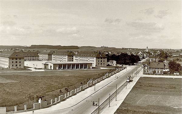 Die nördliche "Reese" (damals Panzerabwehrkaserne) kurz nach der Erbauung in den späten 30er Jahren. Im Vordergrund die Ulmer Straße in Blickrichtung Kriegshaber.
