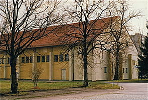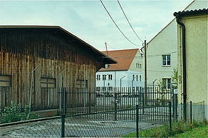 Links: Fahrzeugwaschplatz mit Rampe an der Ulmer Straße, im Hintergrund die St. Thaddäus-Kirche Kriegshaber. Rechts: Sporthalle.