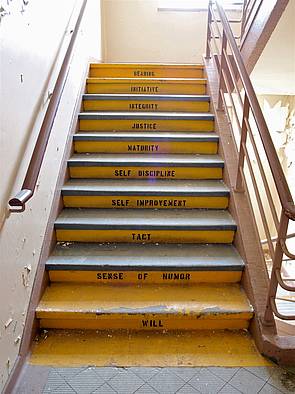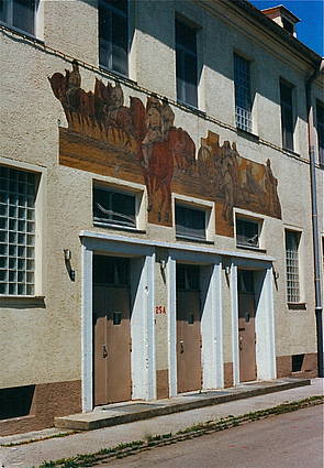 Kasernenkultur verschiedener Armeen: links ein Wandgemälde aus der Wehrmachtszeit (Zugang zur Somme-Mannschaftskantine), rechts amerikanische Dienstmotivation im Treppenhaus eines Unterkunftsgebäudes.
