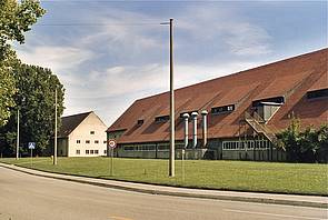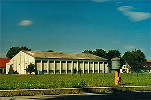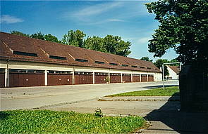 Geb.125 (Fahrzeughalle) mit befestigten Abstellflächen auf der Rückseite.
