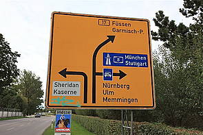 Rechts: Wegweisung am Nestackerweg zum Stadtbergen Gate.