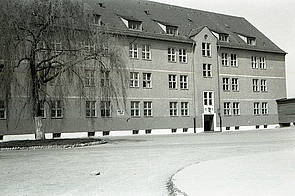 Links: Hauptwache der General-Kneußl-Kaserne am Mittleren Weg. Nach Kriegsende als Hospital genutzt (Geb.152).