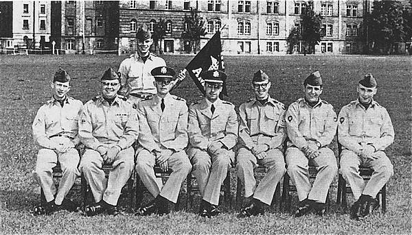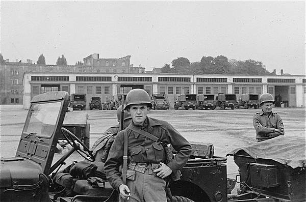 385th Transportation Company, 109th Infantry, am Gebäude 301 an der Schertlinstraße. Im Hintergrund die Bahngleise am Haltepunkt Morellstraße. (Foto: Jonnie Worth, 3rd Bn 109th Inf, 1951).
