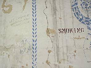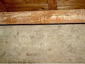 Links: GI Thompson aus Californien verewigte sich 1965 auf dem Dachstuhl des Gebäudes 309 (Nordblock an der Von-der-Tann-Straße). Ein Kamerad aus Cincinnati tat es ihm gleich. Rechts: W.T. Cooper III aus Belleville/Michigan markierte sich am 25. März 1966 am Dachstuhlkamin des Bldg 309. US-amerikanisches Graffiti neben Schmuckbemalung aus der Königlich-Bayerischen Zeit: eine militärische Symbiose ohnesgleichen. Die Fotos entstanden im Jahr 2016.