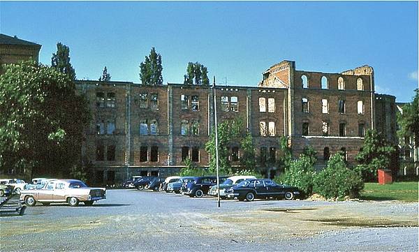 Motorpool-Area mit den Garagen Bldg 310, im Hintergrund der zerbombte Ostflügel des Bldg 309. (Foto: Jonnie Worth, 3rd Bn 109th Inf, 1951).