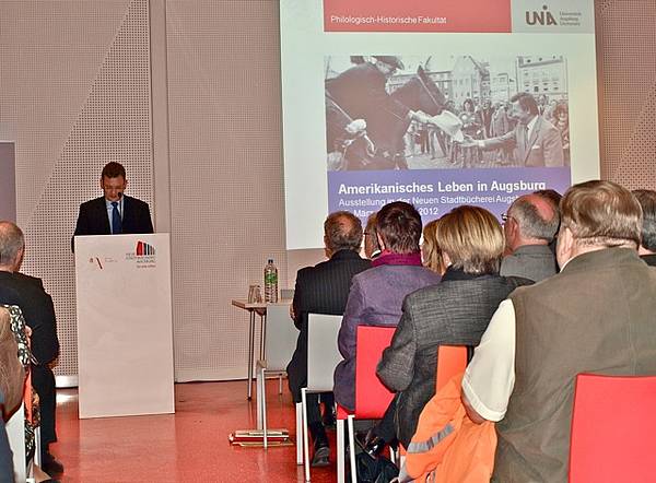Zur Ausstellungseröffnung am Abend des 15. März 2012 kamen u. a. die Präsidentin der Universität Augsburg, Frau Prof. Dr. Sabine Doering-Manteuffel, 2. Bürgermeister Hermann Weber, Alt-Oberbürgermeister Dr. Peter Menacher als Vertreter der Viermetz-Stiftung sowie der amerikanische Generalkonsul in München, Conrad R. Tribble und Frau Prof. Dr. Maria Höhn vom Vassar College New York.