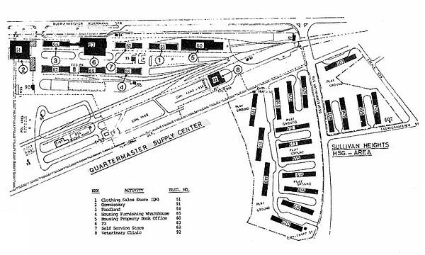Das keilförmige Quartermaster-Gelände nordwestlich von Sullivan Heights mit seiner Eisenbahnanbindung.