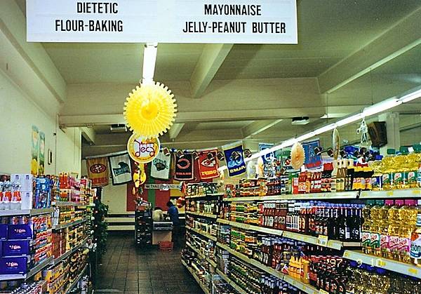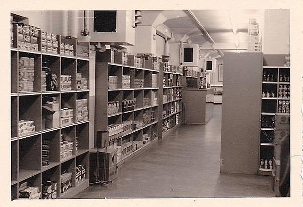Holzregale für Konserven und Fertignahrung um 1950 (Foto: Privat).
