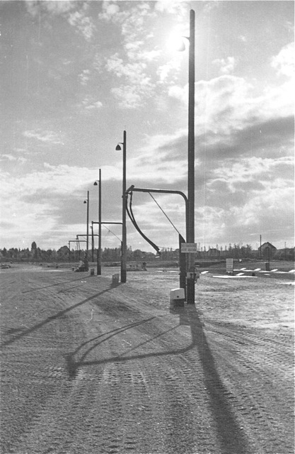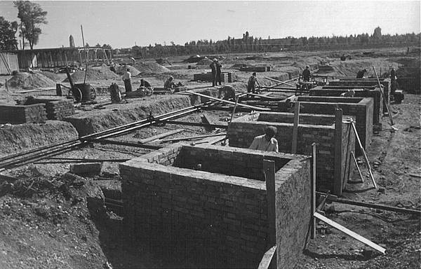 Neubau des Treibstofflagers. Hier werden um 1950 die Domschächte hochgemauert und die Versorgungsleitungen zu den Füllstellen verlegt. Im Hintergrund links die Herz Jesu-Kirche in Pfersee, in Bildmitte der Westfriedhof (Foto: via Reise House).