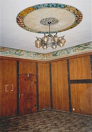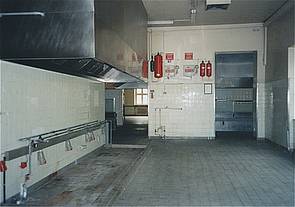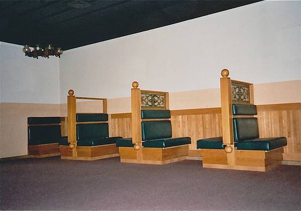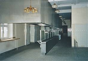 Blick in den Speisesaal mit Sitzbänken (Tische fehlen).