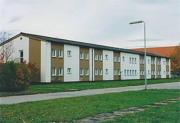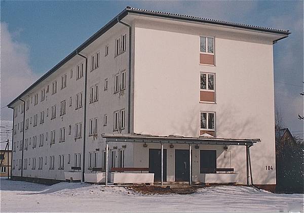 Wohnhaus für unverheiratete Offiziere (Bachelor Officers Quarter). Ulmer Straße 82-92 (Geb. 2027), erbaut ab Mitte der 1930er Jahre, von der U.S. Army umgebaut 1954. In jeder Etage befinden sich 12 Wohnungen. Das Gebäude blieb erhalten.