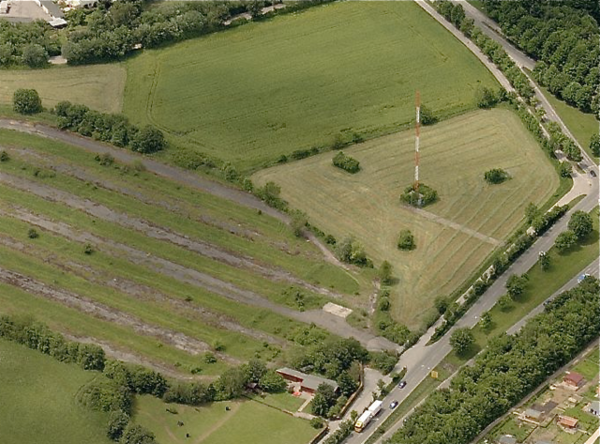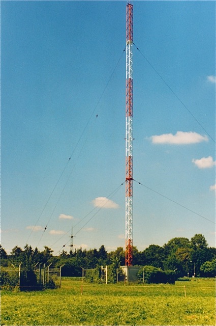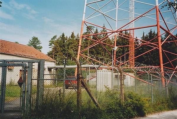 AFN-Mast am Rande des Vehicle Parks: 56m Höhe und 6 to Gewicht. Hier wurde über Mittelwelle 1484 KHz das amerikanische Radioprogramm aus München weitergesendet. Der selbststrahlende Gittermast wurde im Zuge von Straßenbaumaßnahmen demontiert.