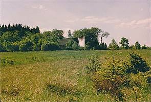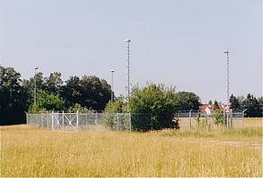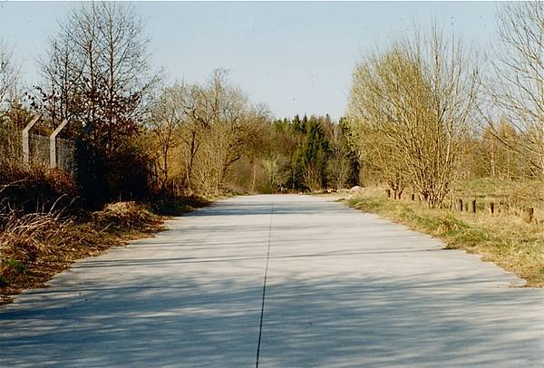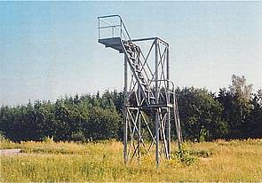 Der Beobachtungsturm am Schießplatz, rechts die Zufahrt in das Übungsgelände.