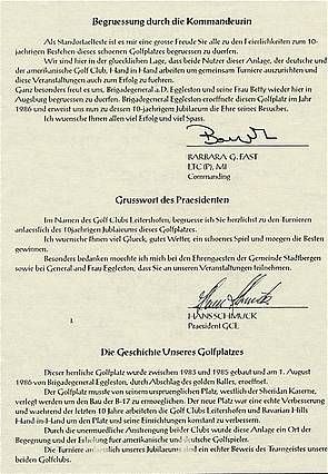 With the new Golf Course at the northern perimeter of the Training Area, the German-American sports friendship became known as the double-named “Golf Club Leitershofen - Bavarian Hills”. Curiously, a number of friendly, peaceful tournaments took place at a military training area. In the summer of 1986, the grand opening by BG Howard C. Eggleston and Stadtbergen’s mayor Raimund Bertele - in whose community the panoramic Golf Course is located - took place. Festive connections with the Kiwanis Club and the German-American Men’s resp. Women’s Club happened once in a while.