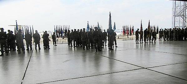 COL Devon Blake bei der Übergabe der Truppenflagge im Hangar der Clay Kaserne.
