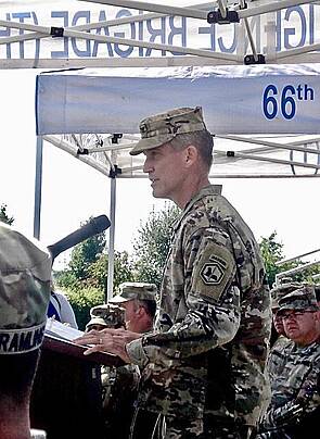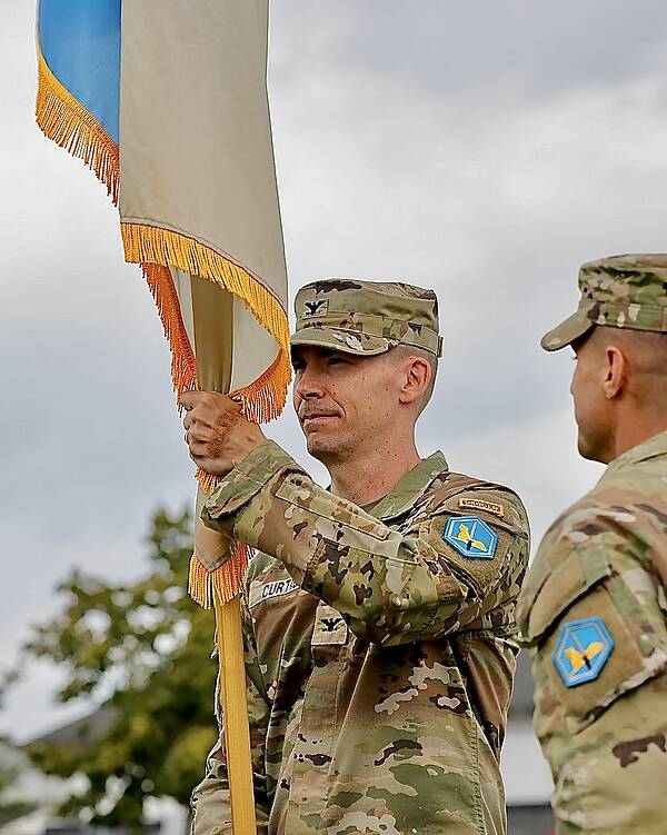 COL Steven Curtis trägt als neuer Commander die Flagge der 66th MI BDE.