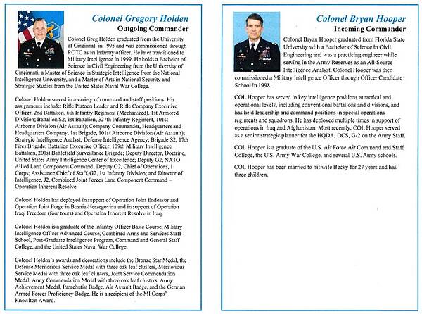 Die kommandierende Generalin des INSCOM, MG Michele H. Bredenkamp, leitete den Wechsel der bisherigen Befehlsgewalt von Commander COL Bryan E. Hooper an COL Christina A. Bembenek. Die Zeremonie fand wie beim letzten Mal auf dem Allen Field in der Clay-Kaserne statt.